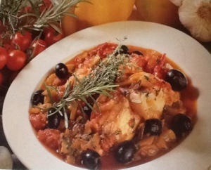 Si infarinano circa 800 gr di coda di rospo a grossi pezzi che si fanno dorare in padella con 4 cucchiai di olio per una decina di minuti, rigirandoli senza romperli. Si sfuma con del vino bianco e si fa evaporare.