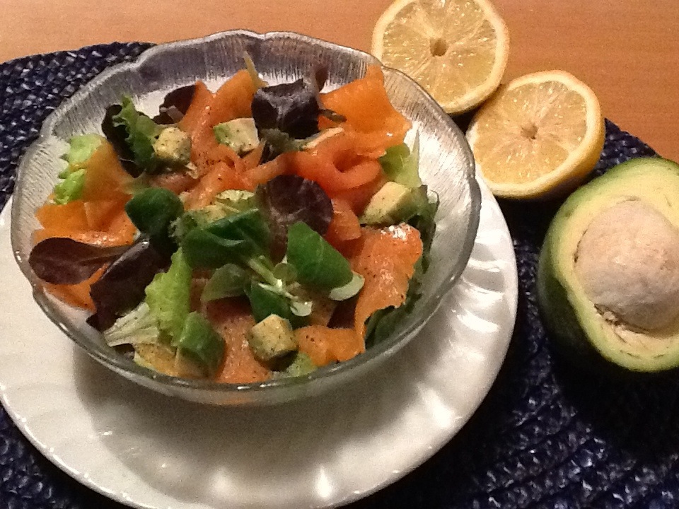 Ieri ho arricchito le 2 solite manciate di insalatina mista con le fettine di 1/2 pompelmo pelato a vivo, 1 avocado maturo a cubetti, 1 cucchiaino di cipolla rossa tritata finemente e alcune fette di salmone affumicato tagliuzzate free style.