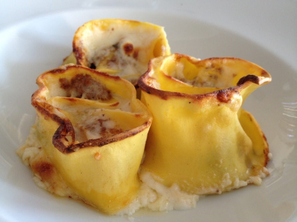 Per farne un piatto più facilmente gestibile ho sostituito la polenta con la sfoglia per lasagne e con gli stessi ingredienti ho preparato le ultime rose di agosto.