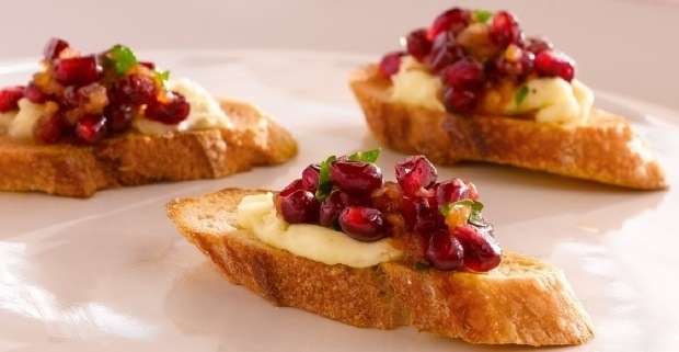 E a proposito di melagrana, vi suggerisco un crostino da servire a San Silvestro sul tavolo del buffet o direttamente sul tavolino da caffè insieme all’aperitivo, perché è molto decorativo, delizioso, stimolante e speriamo anche di buon auspicio.