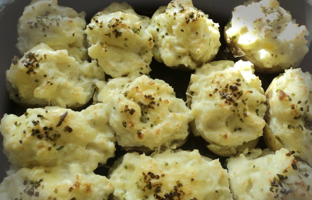 Si lessano 6 piccole patate con la buccia e senza pelarle si tagliano a metà. Si scavano appena e si appoggiano su una teglia da forno. Si salano pochissimo.