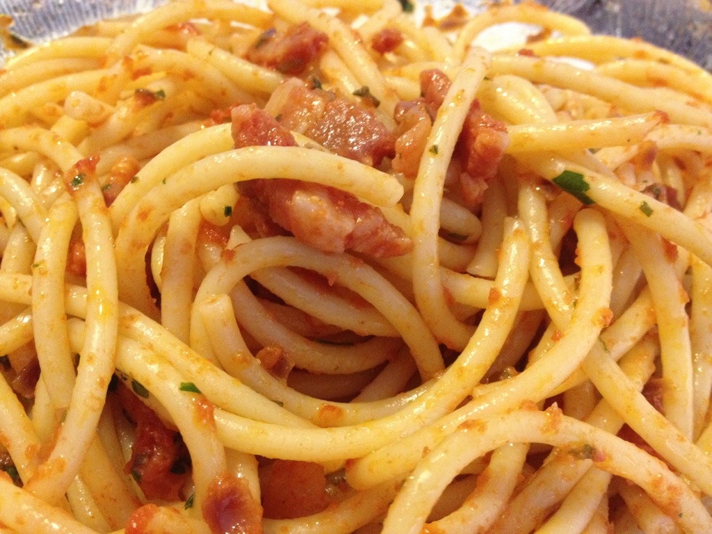 Secondo: la vera Amatriciana (o Matriciana) non prevede l’uso della cipolla, ma solo dell’aglio.