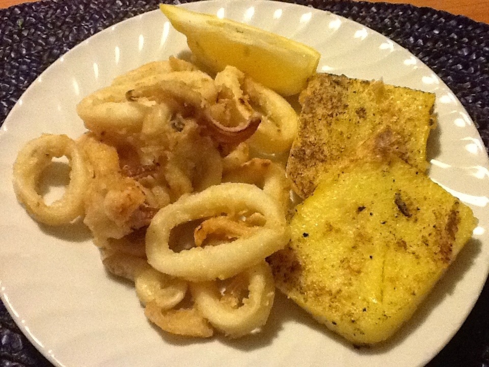La signora Filomena friggeva soprattutto i pesciolini di paranza, ma io sono più selettiva adesso: quella volta all’anno che faccio il pesce fritto con la polenta, mi limito ai calamari tagliati ad anelli che mi sembrano perfetti per la polenta abbrustolita.