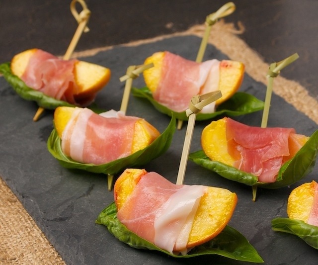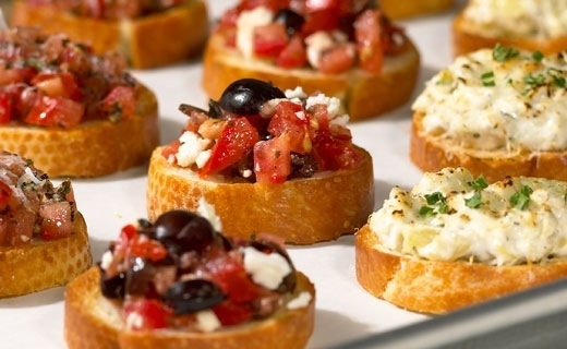 Si prepara per esempio una fresca insalata greca con pomodori a cubetti, olive denocciolate, basilico, menta e formaggio feta. Si miscela tutto e si tiene nel frigorifero fino al momento dell’aperitivo.