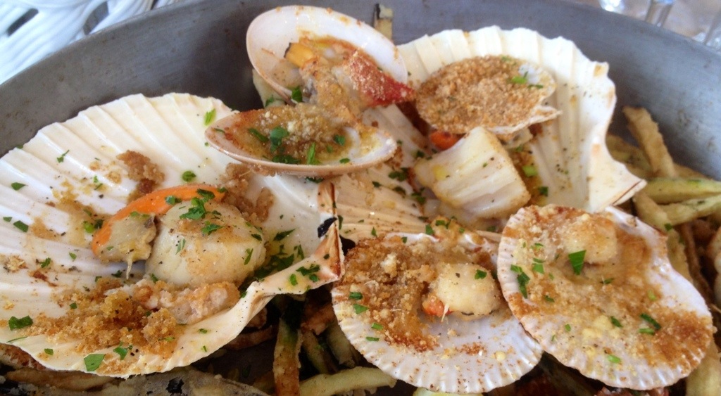 Oggi non posto la consueta ricetta, ma solo la fotografia di un piatto di capesante e canestrelli al gratin (oltre a cozze e fasolari), soprattutto per mostrare la differenza, essenzialmente solo di dimensione, fra questi due molluschi bivalvi dalla bellissima conchiglia detti anche pèttini, per quelli di voi non li conoscono.