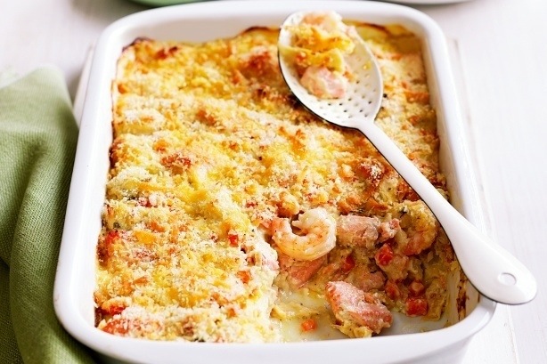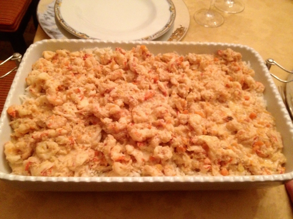 Si distribuisce sul piatto da portata e sopra si versa l’intingolo di gamberi coprendolo completamente.