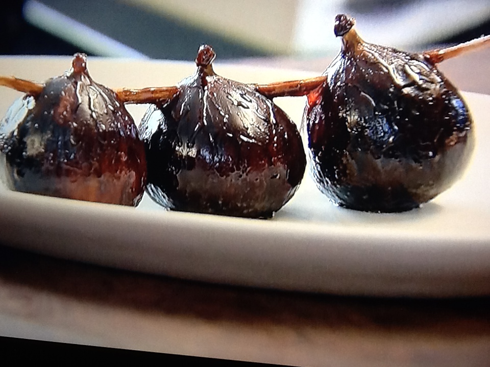 Per ogni porzione bisogna infilzare 3 bellissimi fichi in un rametto di rosmarino a cui sono stati tolti gli aghetti. Se ne può eventualmente lasciare un ciuffetto in cima per decorazione.