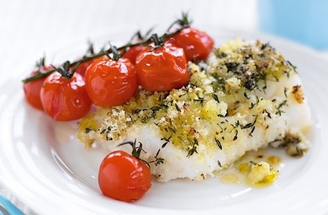 Se utilizzate un filetto di pesce meno spesso del mio trancio di merluzzo, bastano 10 minuti di cottura, quindi si possono infornare insieme pesce e pomodori.