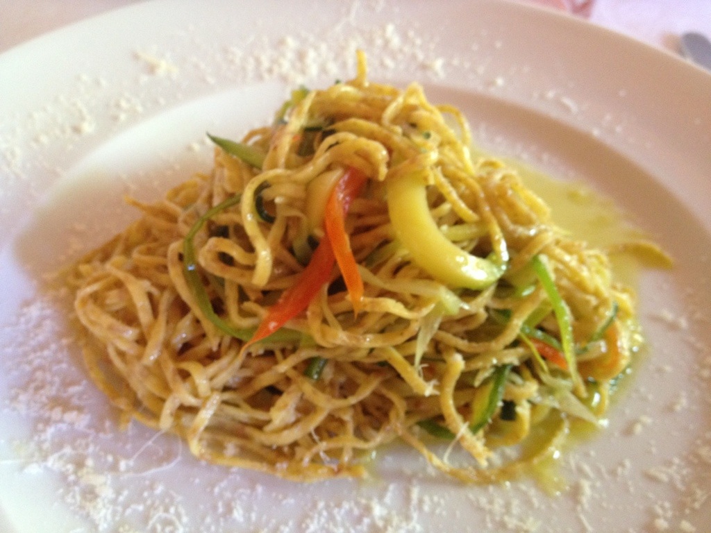 Col suo aiuto infatti si tagliano a julienne tutti gli ortaggi, si fanno saltare con olio, aglio e peperoncino e quando sono appassiti ma ancora croccanti, si versano nel loro tegame i tagliolini e si spadellano velocemente.