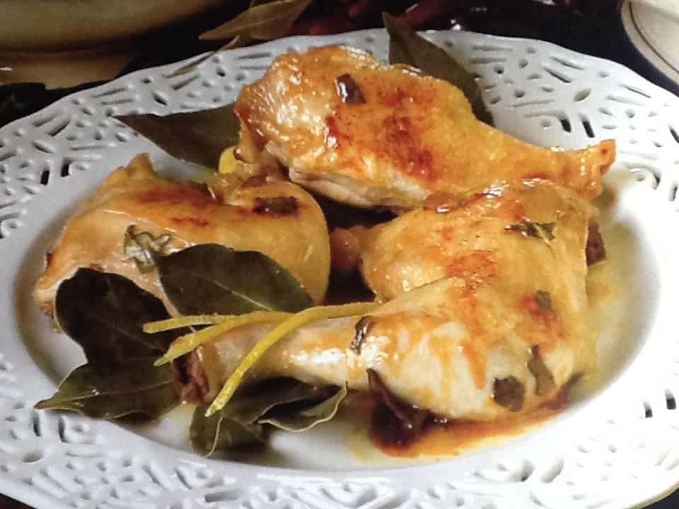 La mia mamma tritava la cipolla e la faceva imbiondire appena in olio e abbondante burro, poi accomodava nel tegame i pezzi di pollo, li irrorava col succo di limone, salava, pepava pochissimo e aggiungeva aglio, alloro e i due mezzi limoni spremuti.