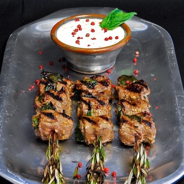 Quando sono tutti pronti, ne infilzo 3-4 alla volta in un rametto di mirto, che donerà agli involtini un profumo intenso e piacevole, ma se quest’anno non vi siete fatti un giro in Sardegna, potete usate il rosmarino, altrettanto aromatico.