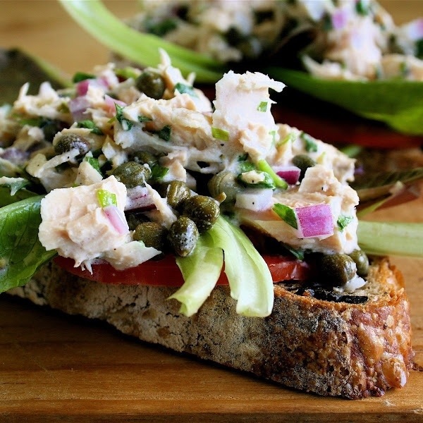 Si aggiungono: una fetta di cipolla rossa a cubetti, la parte verde di 1 cipollotto affettata sottile, 1 cucchiaio di capperi, sciacquati e asciugati, insieme alle foglioline di 1 rametto di timo.